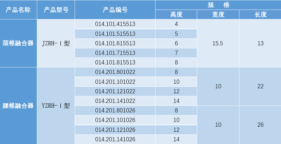 適用于與脊柱內固定產品配合使用,治療脊柱椎間盤突出或退變、椎間隙變窄、腰椎假關節、復位不理想的蛻變性脊柱滑脫或峽部裂滑脫,用于頸椎、腰椎、腰骶段融合固定。