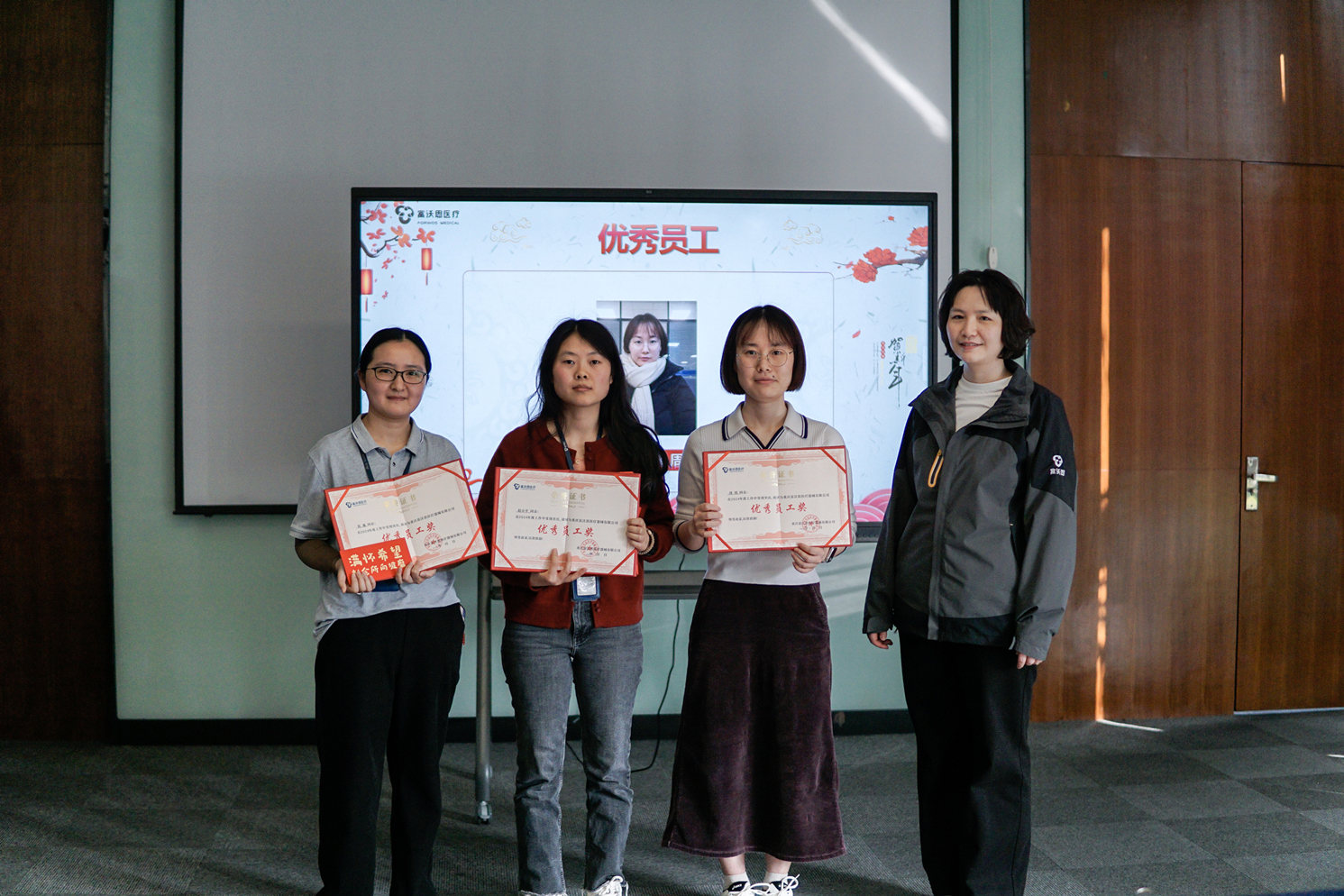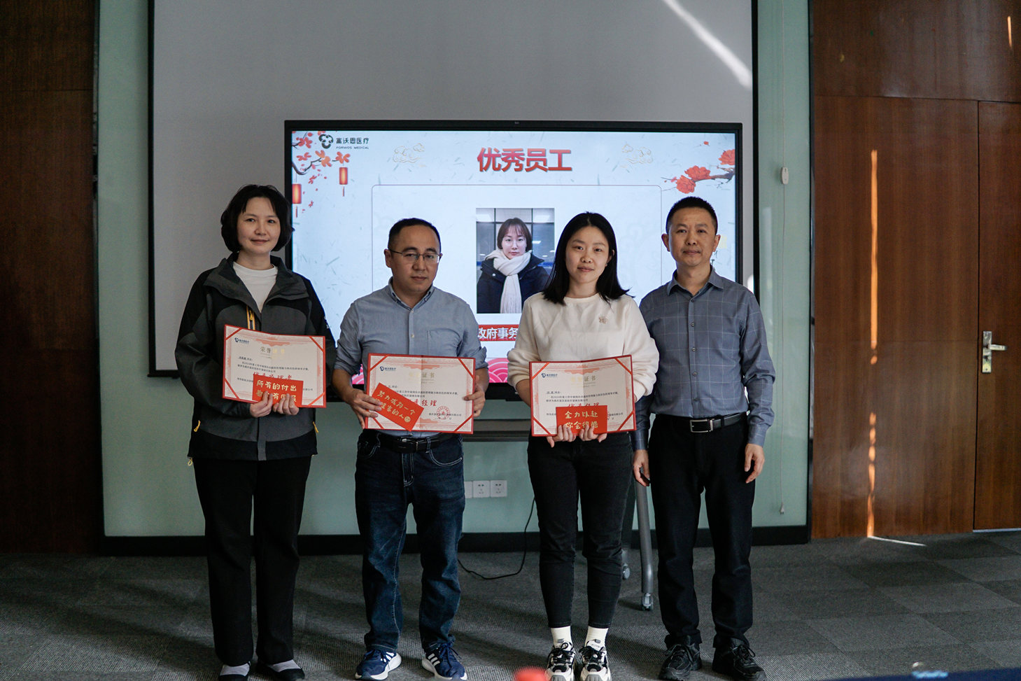 優(yōu)秀員工獎(jiǎng):質(zhì)量部:趙小平(左二)、杜霜(左一)、陳鳳(由趙小平代領(lǐng));政府事務(wù)部:周玥(右二)